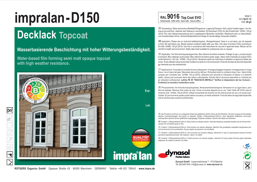 Impralan Deckfarbe D150 ist eine seidenglänzende zwischen- und Endbeschichtung von Fenstern und Türen sowie anderen maßhaltigen Holzbauteilen entsprechend den Richtlinien des Instituts für Fenstertechnik e.v. Rosenheim.