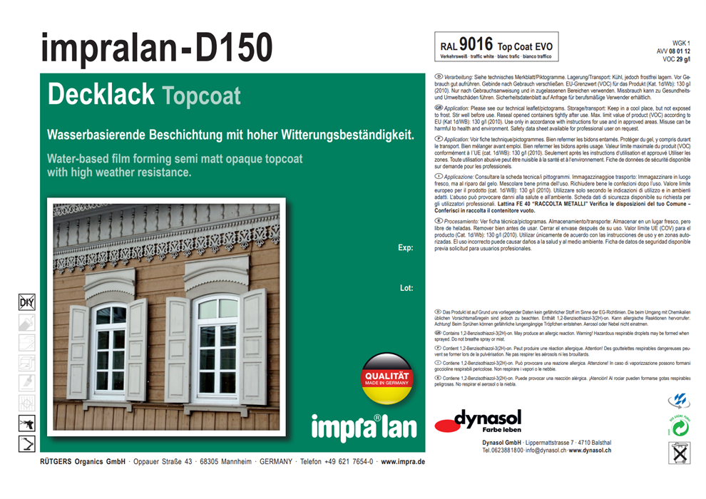Impralan Deckfarbe D150 ist eine seidenglänzende zwischen- und Endbeschichtung von Fenstern und Türen sowie anderen maßhaltigen Holzbauteilen entsprechend den Richtlinien des Instituts für Fenstertechnik e.v. Rosenheim.